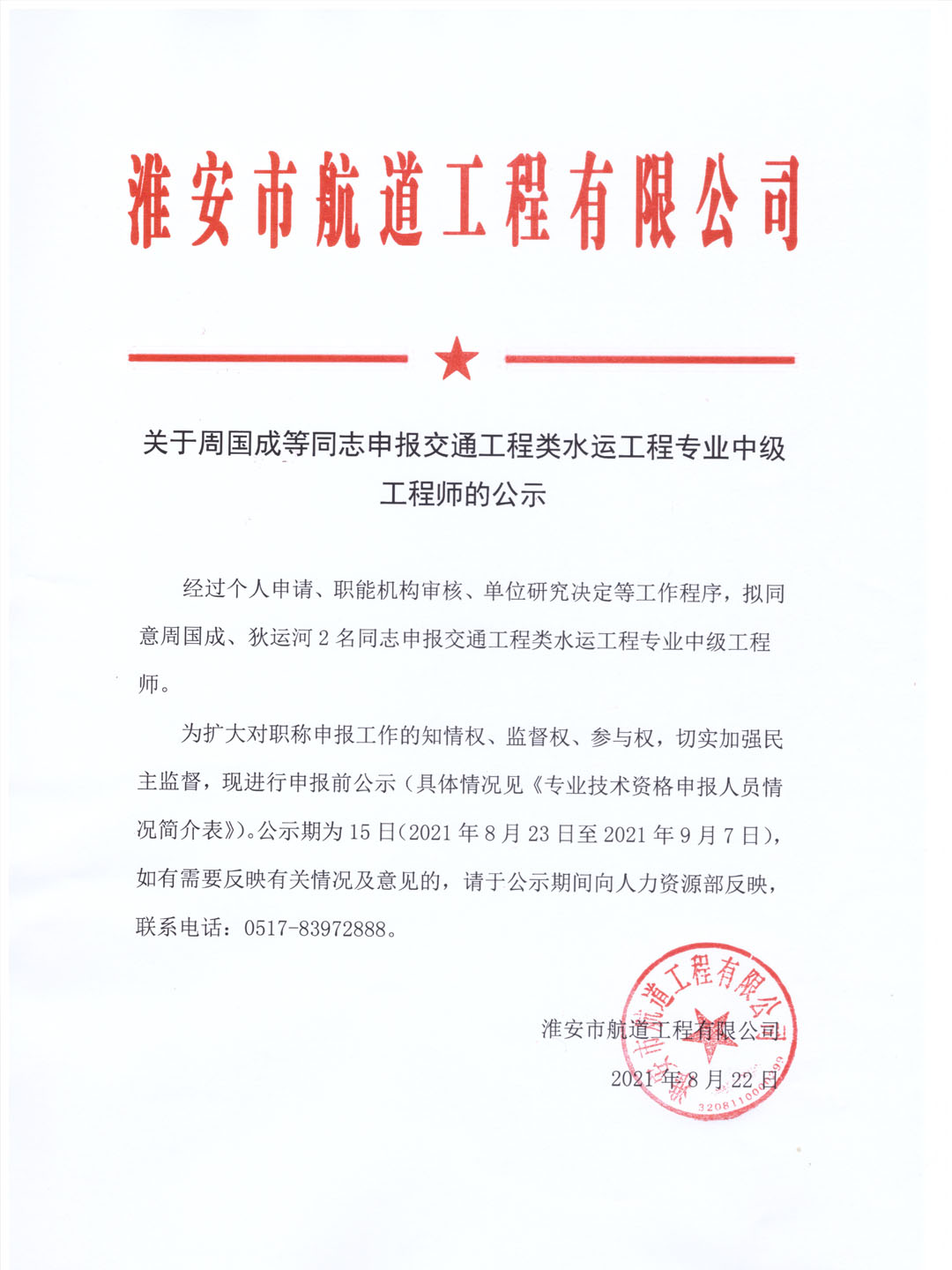 關(guān)于周國成等同志申報交通工程類水運工程專業(yè)中級工程師的公示
